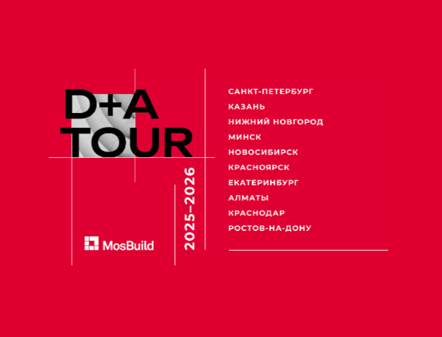 MosBuild D+A Tour — серия мероприятий для взаимодействия с крупнейшими региональными сообществами дизайнеров и архитекторов. Лекции амбассадоров проекта и гуру индустрии, локальные производства и тренды, презентации и мастер-классы — в программе 10 городов России и СНГ: Санкт-Петербург, Казань, Нижний Новгород, Минск, Новосибирск, Красноярск, Екатеринбург, Алматы, Краснодар, Ростов-на-Дону.